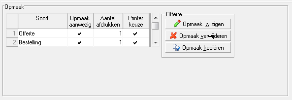 U kunt hier ook een opmaak (lay-out / layout) kopiëren uit de huidige of andere administraties en uit de standaard opmaken. Verder kunt u hier de printerkeuze activeren en het standaard aantal afdrukken per factuur opgeven.