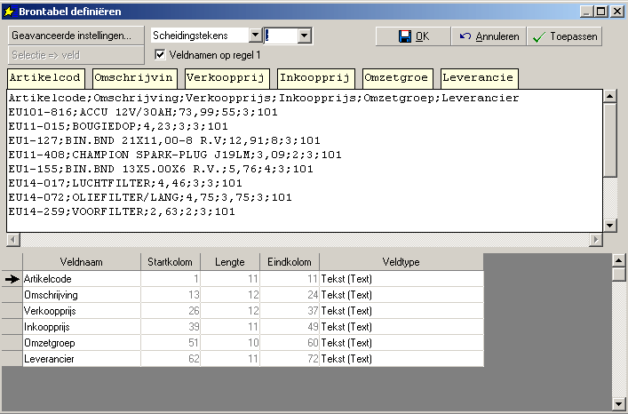 dit voorbeeld zijn de veldnamen op regel 1 geplaatst.