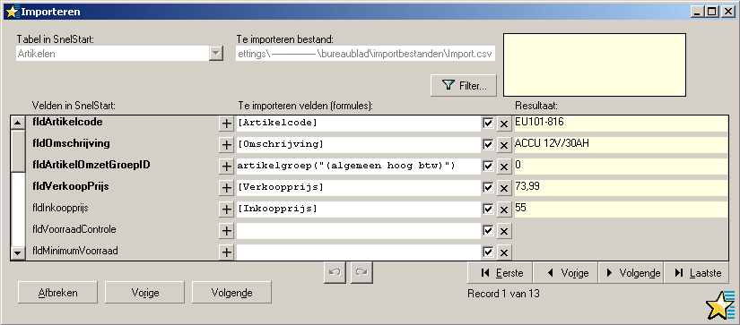In dit venster worden de velden uit het importbestand aan de velden in SnelStart gekoppeld.